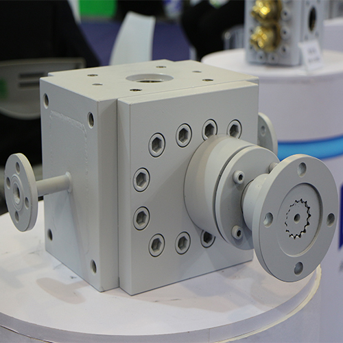 一臺完整的齒輪泵包括馬達、減速器、聯軸器和泵頭幾部分,泵頭部分由泵殼、前后側蓋、齒輪軸、滑動軸承和軸封構成。高溫齒輪泵屬于正位移泵,工作時依靠主、從動齒輪的相互嚙合造成的工作容積變化來輸送熔體。工作容積由泵體、齒輪的齒槽及具有側板功能的軸承構成。 當齒輪如圖1所示方向旋轉時,熔體即進入吸入腔兩齒輪的齒槽中,隨著齒輪轉動,熔體從兩側被帶入排出腔,齒輪的再度嚙合,使齒槽中的熔體被擠出排出腔,壓送到出口管道。只要泵軸轉動,齒輪就向出口側壓送熔體,因此泵出口可達到很高的壓力,而流量與排出壓力基本無關。